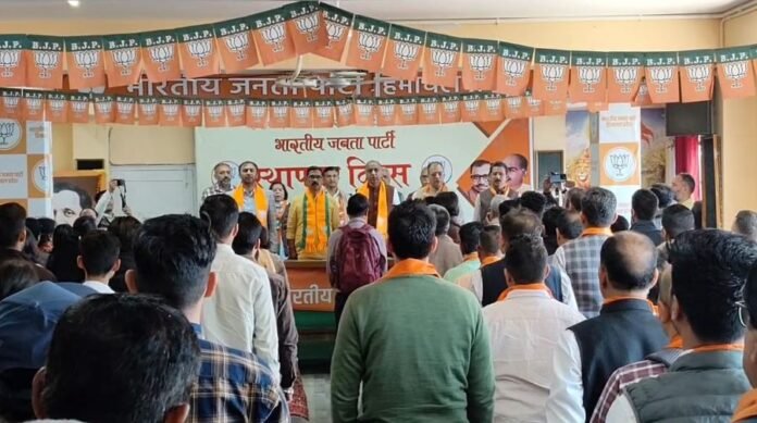 शिमला स्थित भारतीय जनता पार्टी के प्रदेश मुख्यालय दीपकमल चक्कर में पार्टी के स्थापना दिवस पर भव्य कार्यक्रम का आयोजन किया गया। इस अवसर पर नेता प्रतिपक्ष जयराम ठाकुर ने भाजपा का ध्वज फहराकर समस्त कार्यकर्ताओं को इस पावन पर्व की शुभकामनाएं दीं। कार्यक्रम में संगठन महामंत्री सिद्धार्थन, पूर्व मंत्री सुरेश भारद्वाज, मीडिया प्रभारी कर्ण नंदा, प्रदेश उपाध्यक्ष संजीव कटवाल, कार्यालय सचिव प्रमोद ठाकुर, कोषाध्यक्ष कमल सूद, प्रत्याशी रवि मेहता, संजय सूद, जिला अध्यक्ष केशव चौहान सहित बड़ी संख्या में कार्यकर्ता मौजूद रहे।