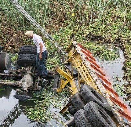 Witnesses reported that the truck was traveling at a considerable speed when it approached a bend in the road, and the driver appeared to struggle with controlling the heavy vehicle. Moments later, the trailer slipped off the embankment and into the Lasada drain, causing a resounding crash that echoed through the village. Local residents rushed to the scene and alerted the authorities, who arrived promptly to coordinate rescue and recovery efforts. The driver, however, could not be saved and was declared dead on the spot.