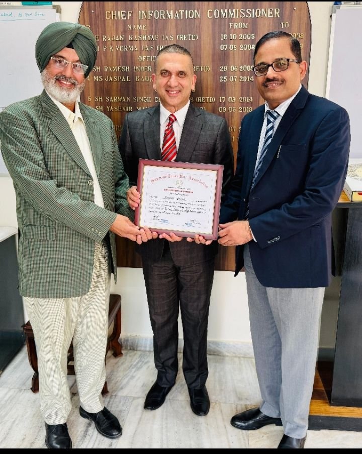 26 ਨਵੰਬਰ, 2025 ਨੂੰ ਨਵੀਂ ਦਿੱਲੀ ਵਿੱਚ ਸੰਵਿਧਾਨ ਦਿਵਸ ਸਮਾਗਮ ਮੌਕੇ ਸ੍ਰੀ ਗੁਰੂ ਤੇਗ਼ ਬਹਾਦਰ ਸਾਹਿਬ ਜੀ ਦੇ 350ਵੇਂ ਸ਼ਹੀਦੀ ਦਿਹਾੜੇ ਨੂੰ ਸਮਰਪਿਤ ਕਿਤਾਬ ਦੇ ਲੇਖਣ ਲਈ ਭਾਰਤ ਦੇ ਮਾਣਯੋਗ ਚੀਫ਼ ਜਸਟਿਸ ਵੱਲੋਂ ਰਾਜ ਸੂਚਨਾ ਕਮਿਸ਼ਨਰ ਪੰਜਾਬ ਸ੍ਰੀ ਹਰਪ੍ਰੀਤ ਸੰਧੂ ਨੂੰ ਸਨਮਾਨ ਪੱਤਰ ਦਿੱਤਾ ਗਿਆ ਸੀ, ਜਿਸ ਲਈ ਮੁੱਖ ਸੂਚਨਾ ਕਮਿਸ਼ਨਰ ਸ੍ਰੀ ਇੰਦਰਪਾਲ ਸਿੰਘ ਧੰਨਾ ਅਤੇ ਪ੍ਰਸ਼ਾਸਕੀ ਸੁਧਾਰ ਦੇ ਵਧੀਕ ਮੁੱਖ ਸਕੱਤਰ ਸ੍ਰੀ ਡੀ.ਕੇ. ਤਿਵਾੜੀ (ਆਈ.ਏ.ਐਸ.) ਨੇ ਉਨ੍ਹਾਂ ਦੀ ਭਰਵੀਂ ਸ਼ਲਾਘਾ ਕੀਤੀ ਹੈ।
